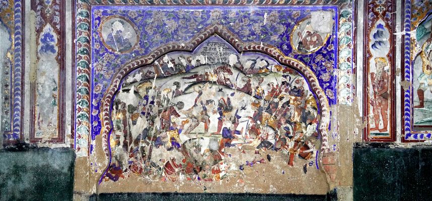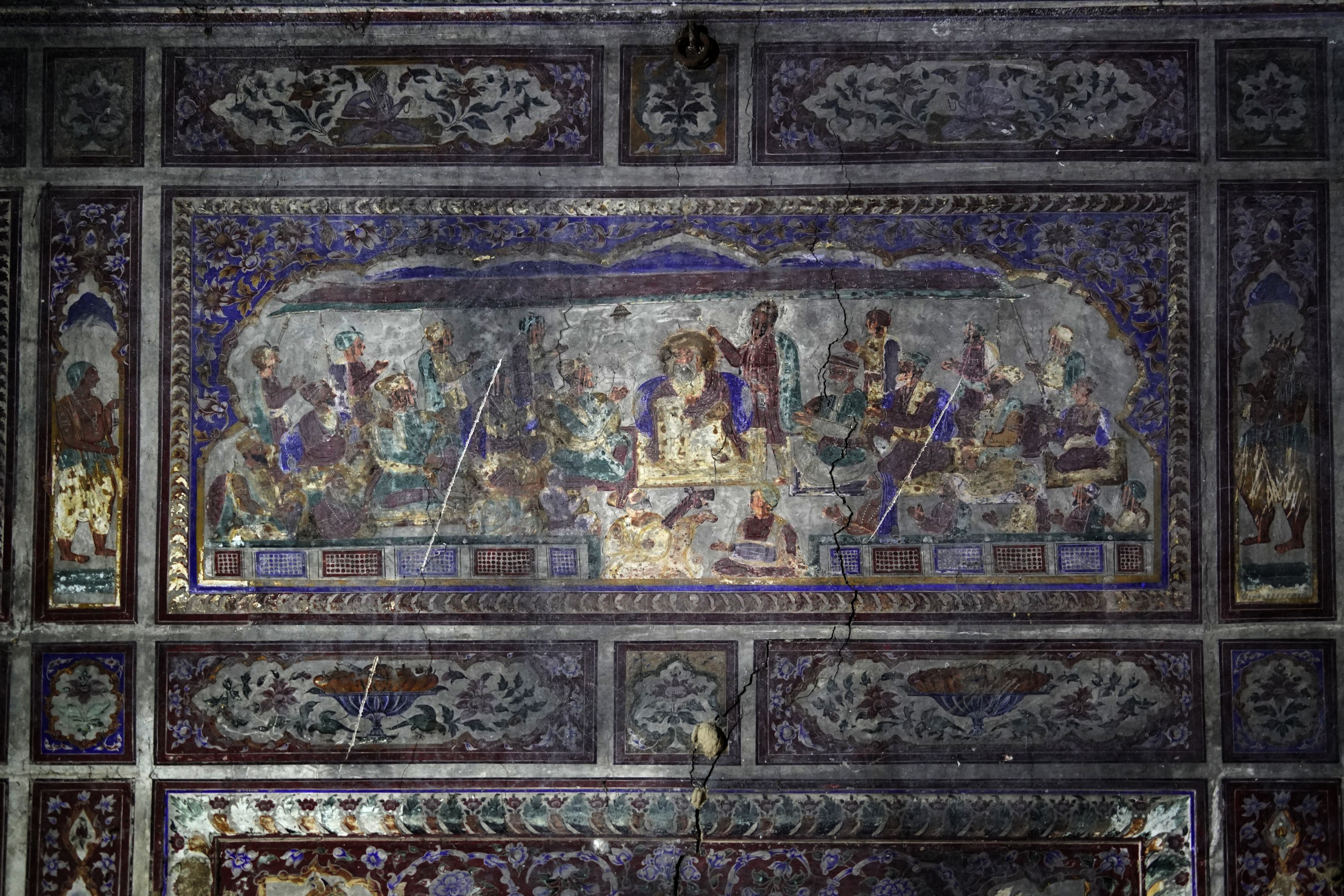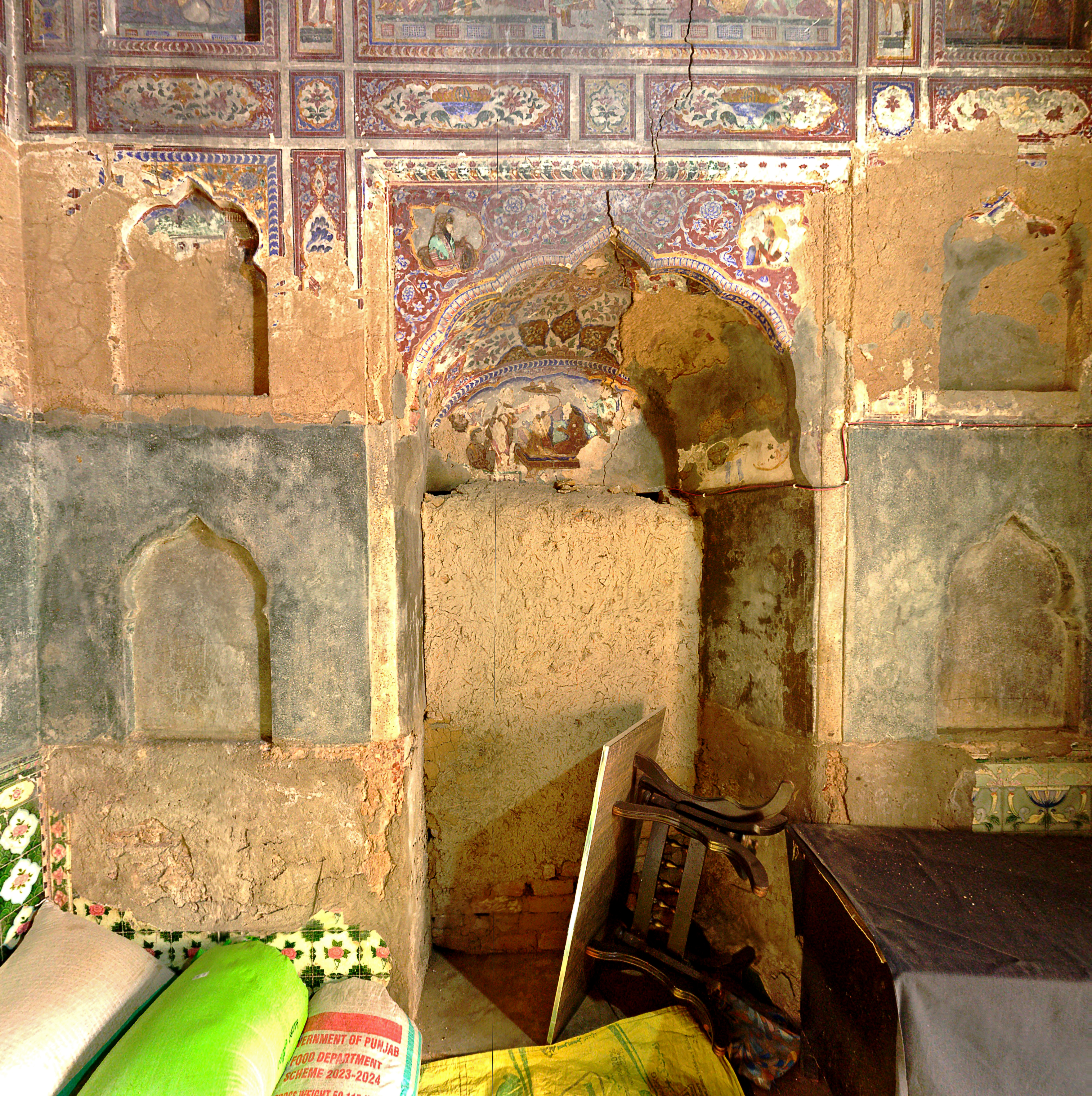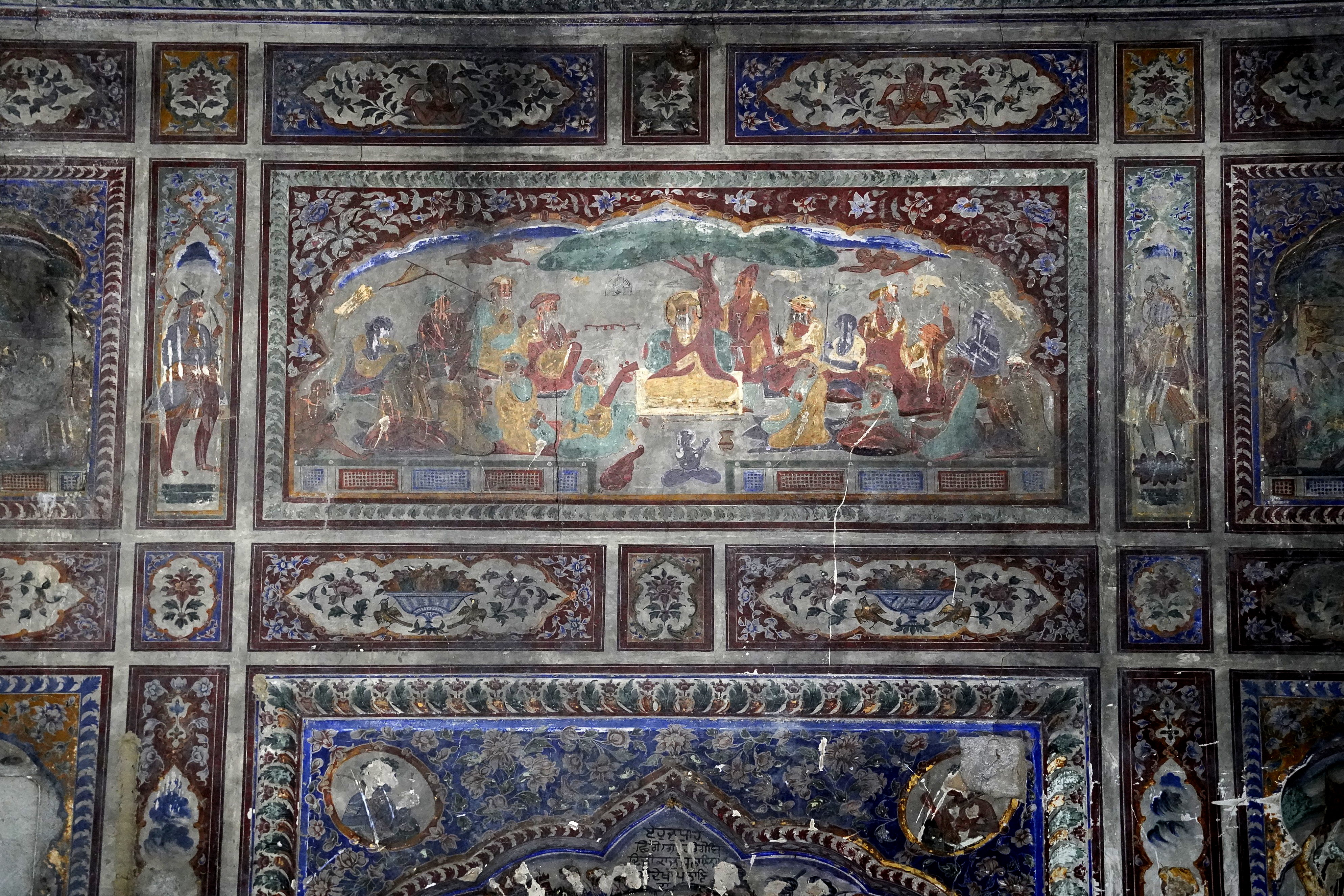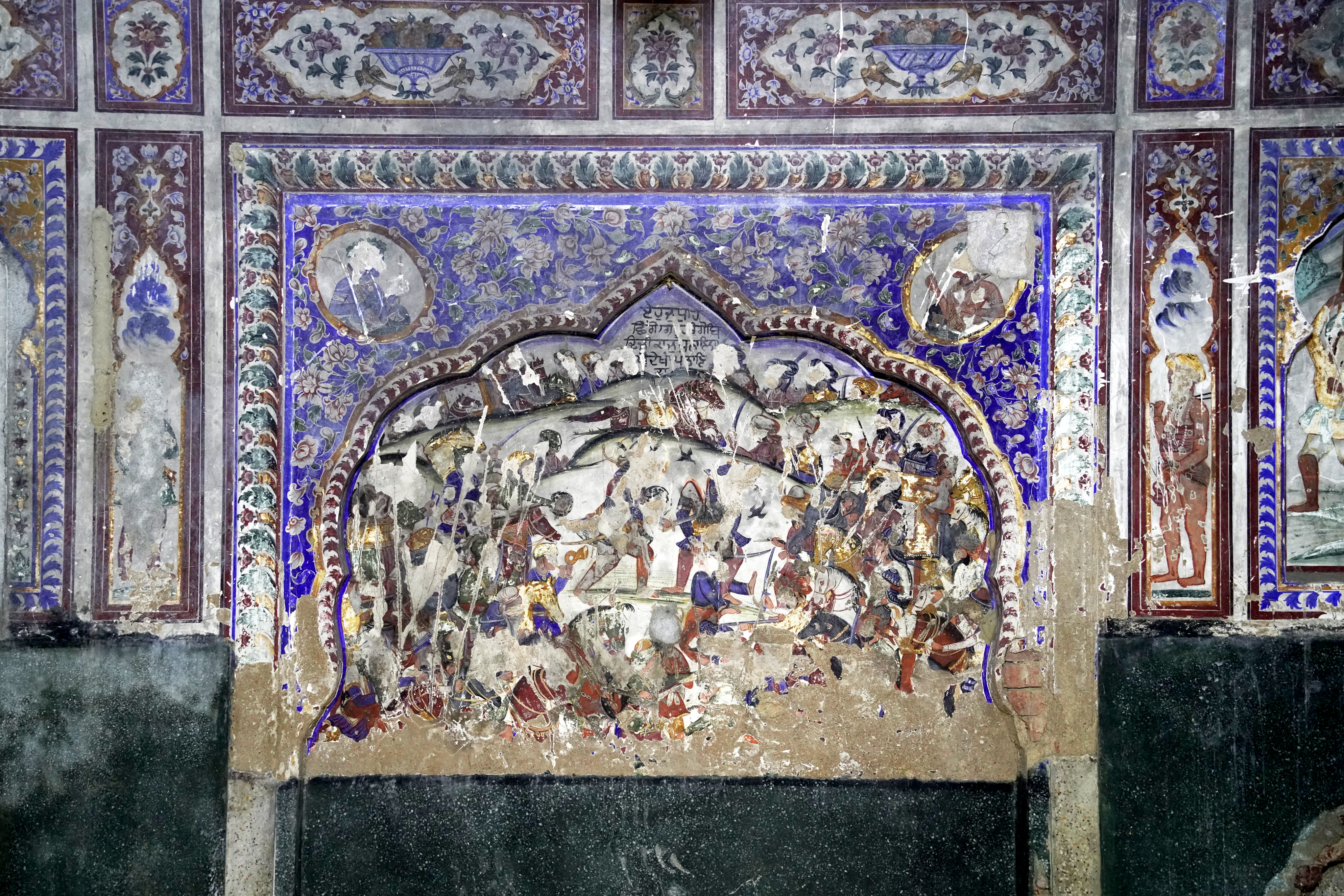 Even to date, the interior walls still display alluring frescoes, including those of various Sikh Gurus, along with a rare painting depicting the encounter of Guru Hargobind against Painde Khan at Kartarpur. The records of Bhatt Vahi Multani Sindhi, Banjharut Jalauton describe the battle scene:
