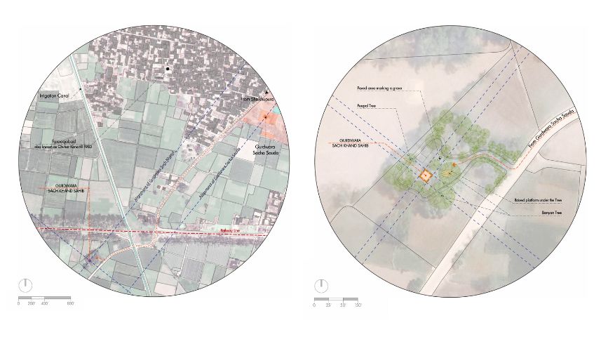 The Peepal and Banyan trees with raised platforms provide intimate spaces for reflection and communal interaction. These shaded areas offer quiet spots for meditation or casual gatherings, extending the spiritual experience beyond the main Gurdwara structure. The winding pathways gently guide visitors through the site, creating a sense of pilgrimage and gradual transition from the secular to the sacred. The surrounding open fields and irrigation canals create a serene buffer, isolating the Gurdwara from urban noise and ensuring a peaceful environment.